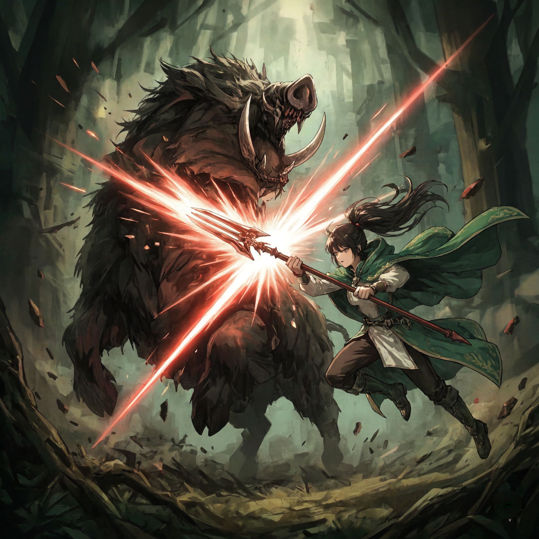 誰も反論することなく静かに後退し、自分だけが前に押し出される形となった。 木々の隙間から、巨大な影がゆっくりと姿を現した。イノシシに似たその魔獣は、地面に爪を食い込ませるようにして重たい足音を響かせている。その巨体は3メートルを優に超え、剛毛に覆われた筋肉の塊のようだ。鋭い牙が光を反射しながらこちらを睨むように向けられる。