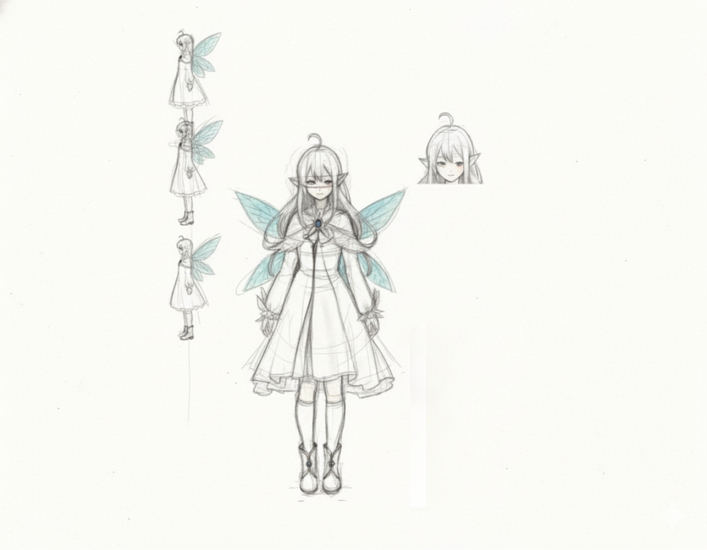 設定資料など銀髪の妖精族。リム=リ=エッタ。初期ラフスケッチです。エッタは実は初期構想では、もう少しお姉さんキャラクターでしたが、もう少し一般的なイメージの妖精に寄せることで、今のようになりました。思ったより可愛いキャラクターに仕上がって個人的に満足しています。