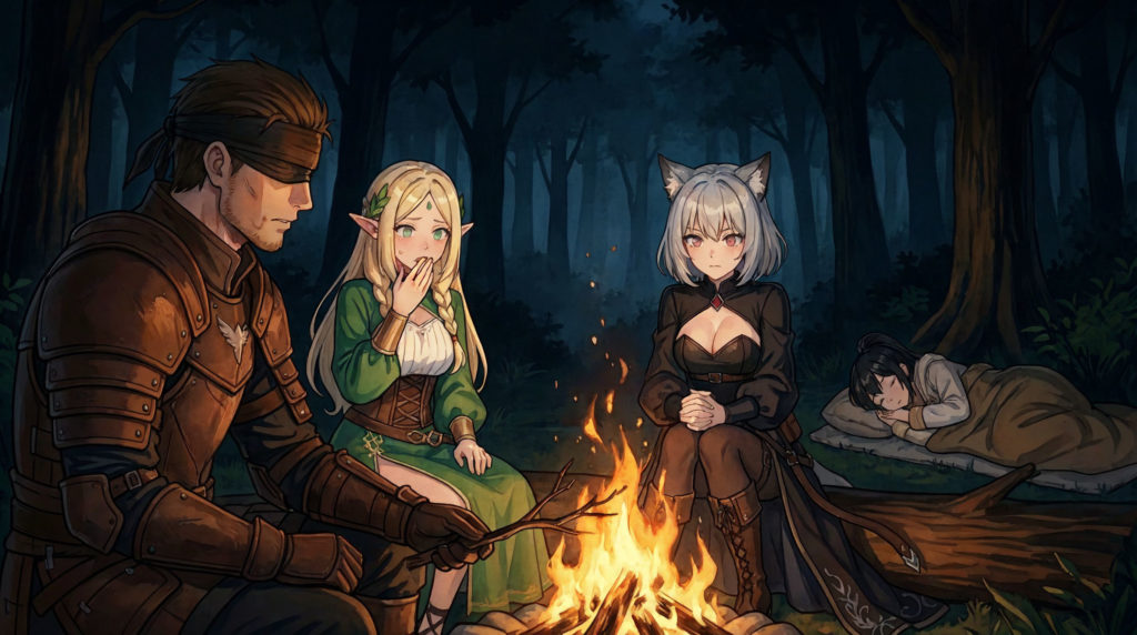 その場に静寂が戻る。焚き火の音だけが響き、三人の間に緊張が漂った。ゼフィルが短く息をついた。