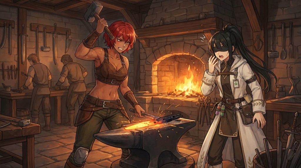 ニナは作業台に腰掛け、興味津々といった様子でこちらを見つめている。その横ではごうごうと燃える炉の熱気が揺らめき、鍛冶場の鉄の匂いが濃く漂っていた。